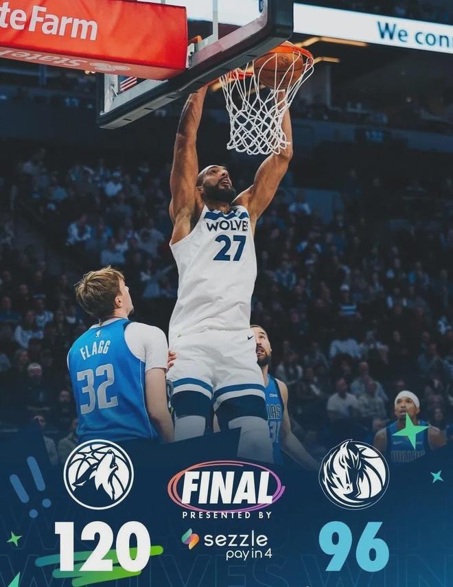 森林狼6人上双大胜独行侠 状元对决华子三分7中1弗拉格15分 -